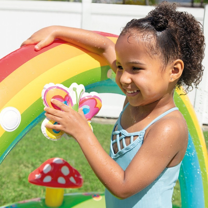 Aussi vive et gaie que rafraichissante grâce à son bassin et à son jet d’eau, cette aire de jeux gonflable amuse