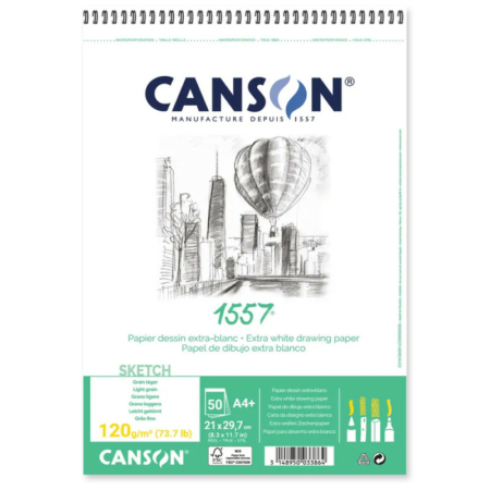 Bloc avec spirale. Le papier 1557 est un papier sans acide à grain léger adapté à l’étude, au croquis et au dessin. 100% alpha-cellulose, ne contient pas de fibres de bois. Collé dans la masse et en surface, il résiste aux frottements répétés et ne pel