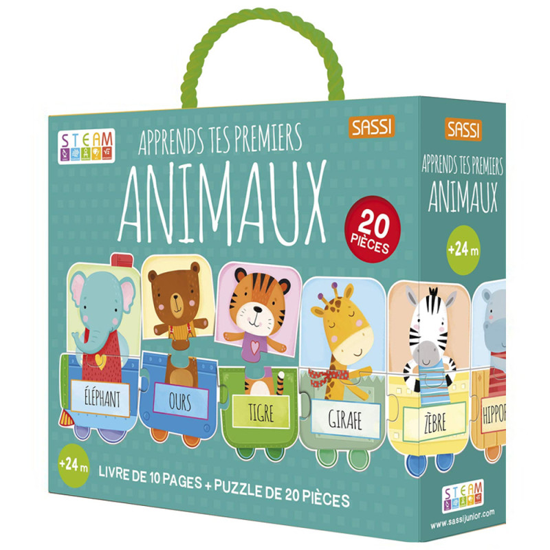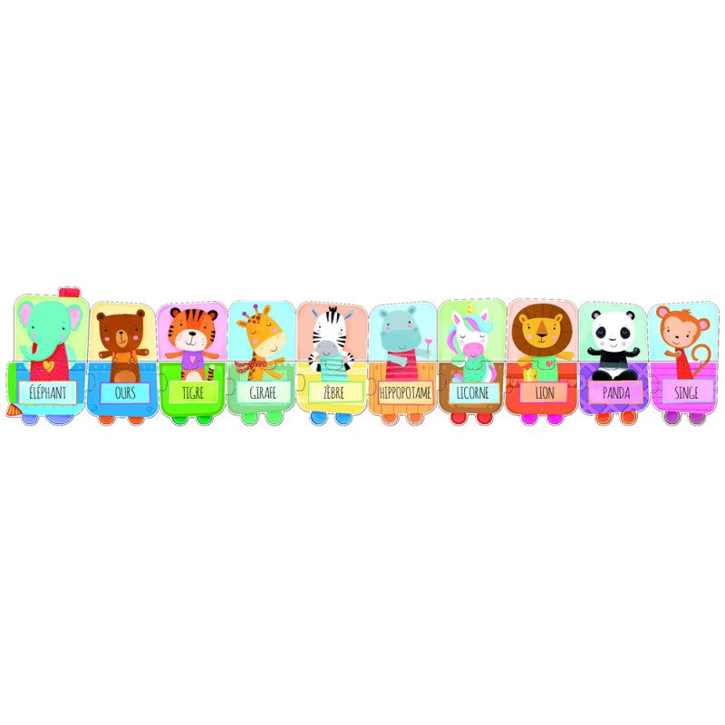 Un livre et puzzle avec 10 pièces géantes pour s’amuser à créer ton petit train des animaux. Contenu : Un livre de 10 pages et un puzzle de 20 pièces