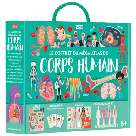 Le corps humain est une machine extraordinaire qui permet de respirer, de penser, de courir, de se nourrir, d’interagir avec les autres… et bien plus encore ! Lis l’atlas et ses 64 pages étonnantes, réponds aux questions des 40 cartes, assemble les 5
