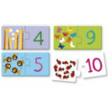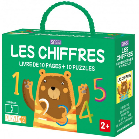 Découvrez le coffret livre et puzzle Les chiffres de Sassi, un cadeau éducatif pour les enfants dès 2 ans comprenant un livre de 10 pages en carton et 10 puzzles de 2 pièc