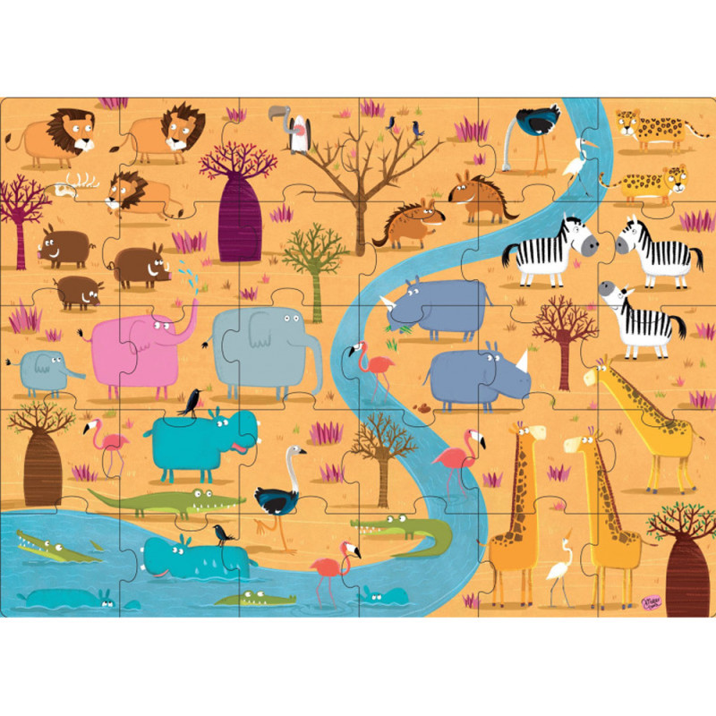 Assemble le puzzle et découvre l’éléphant qui se baigne, la girafe qui grignote les feuilles des arbres et l’hippopotame qui joue dans l’étang. Puis retrou