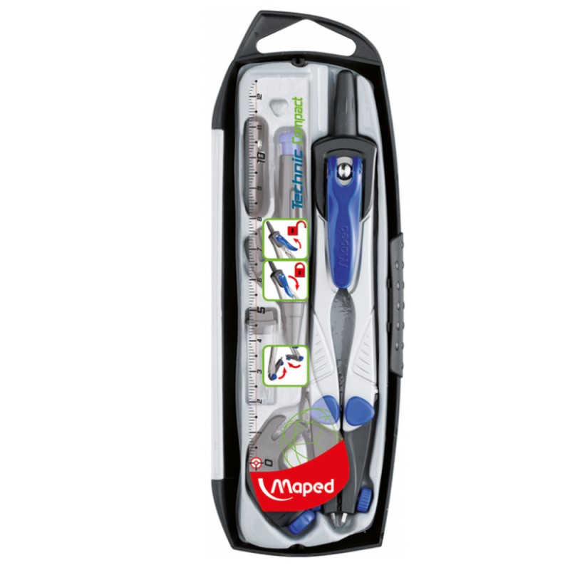 compas, bague universelle, porte-mines 0,5 mm, réservoir à mine, taille-mine + règle gratuite Com