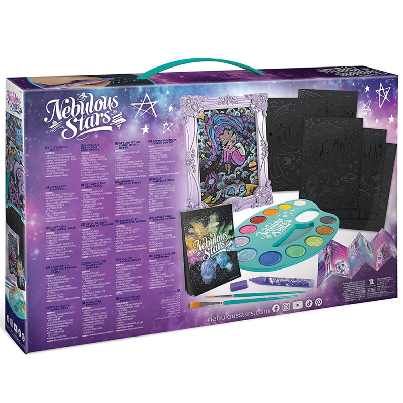 Tout ce dont vous avez besoin pour créer des chefs-d’œuvre dignes d’un ciel étoilé Peignez et affichez 6 chefs-d’œuvre d’aquarelle de magie noire dans un magnifique cadre photo qui brille dans le noir. Le kit comprend une palette de peinture de couleur