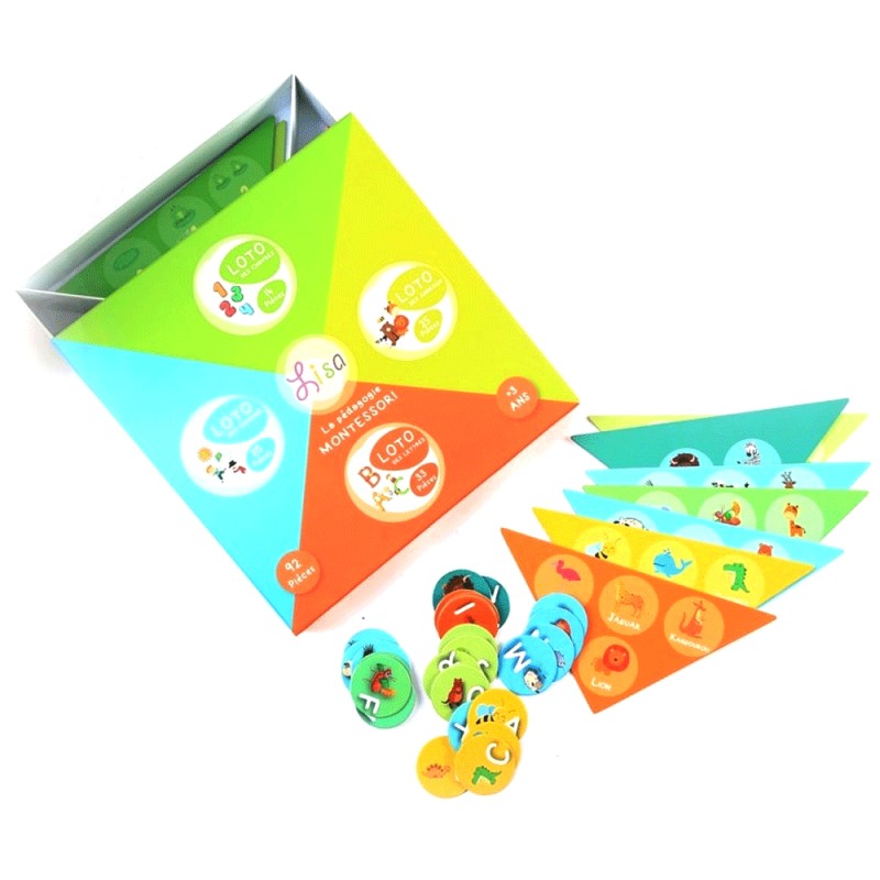 Les lotos 4 en 1 sont des packages éducatifs économique qui combine 4 lotos en même temps. Les lotos chiffres et lettres combiner avec un loto des formes et un loto des animaux. Le nombre total des pièces est égal à 92.
