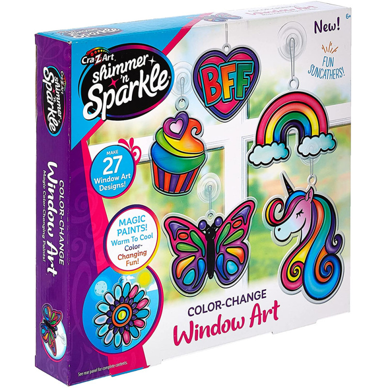 C’est le Cra-Z-Art Shimmer ‘n Sparkle Color Change Window Art ! Un kit de créateur d’attrape-soleil DIY cool ! Créez votre propre magnifique art de fenêtre ! Peignez-le! Pelez-le ! Collez-le ! Réalisez 27 superbes designs d’art de fenêtre ! La peinture