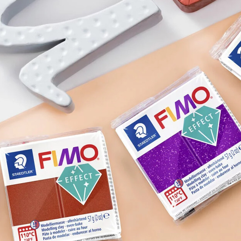 FIMO EFFECT vient parfaitement compléter FIMO soft et FIMO professional. Avec cette pâte à modeler, réalisez de magnifiques effets : en fonction de la couleur que vous utilisez, vos modelages auront l’apparence de la pierre, scintiller