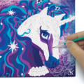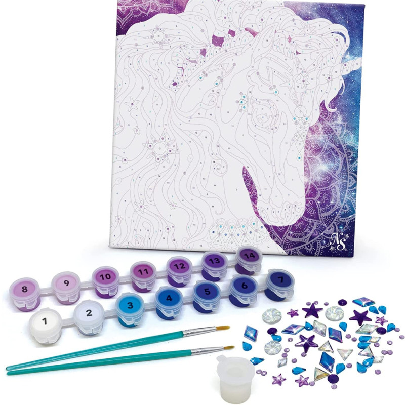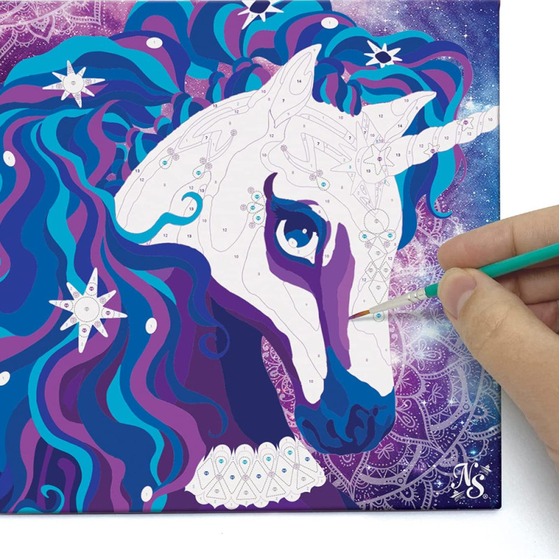 Peinture à numéros traditionnelle réalisée sur une toile tendue sur un cadre de bois. Fais briller ta création en y apposant des strass et un vernis étincelant !