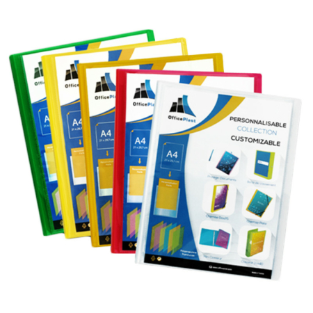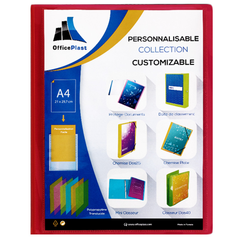 Protège-documents personnalisable Evidence conçu en polypropylène translucide au niveau de la couverture, épaisseur 5/10mm (500µm), avec un effet brillant, Equipé de pochettes lisses à haute transparence de 40µm) permettant une lisibilité des contenus,