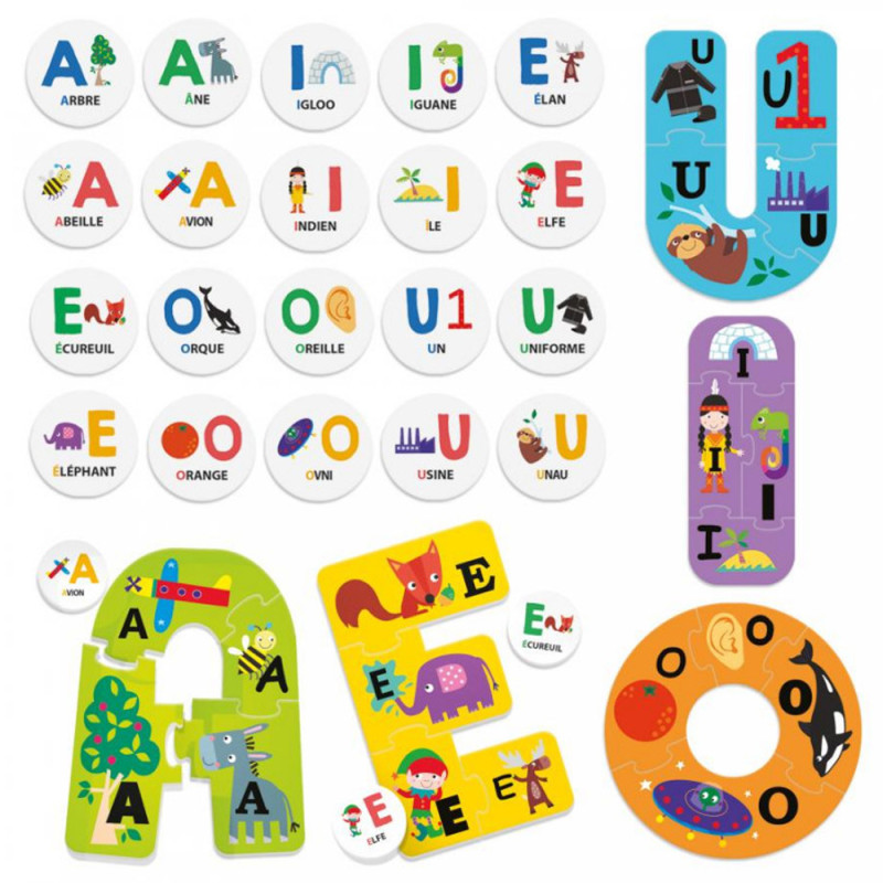 Sur chacune des pièces qui composent une voyelle donnée, l’enfant pourra observer un sujet, dont l’initiale correspond à la voyelle en question. À côté des objets illustrés, la voyelle qu’ils illustrent est imprimée en relief et peut être tracée avec l