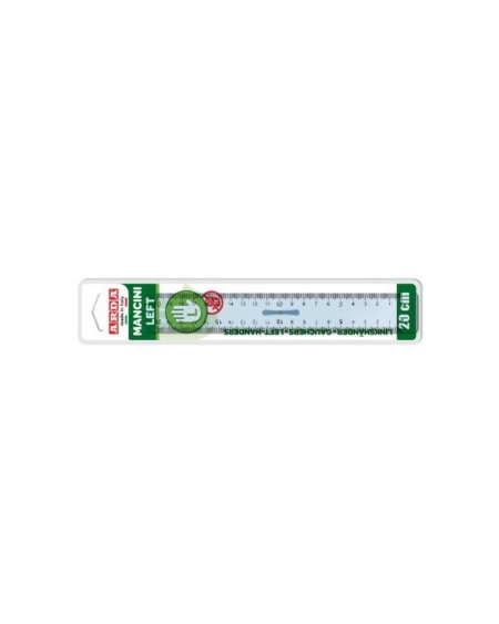Latte double décimètre de 20cm pour gauchers. Design ergonomique et coins arrondis pour plus de sécurité. Graduations gravées. Coloris: transparant. Pochette blister.