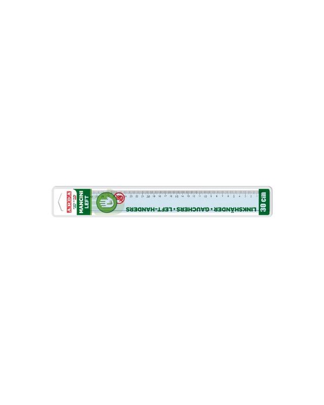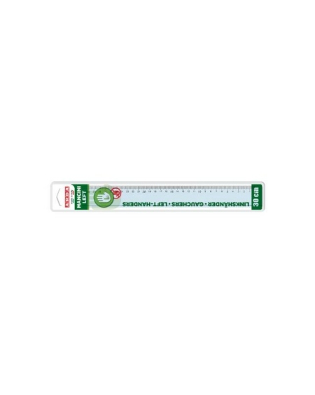 Latte de 30cm pour gauchers. Design ergonomique et coins arrondis pour plus de sécurité. Graduations gravées. Coloris: transparant. Pochette blister.