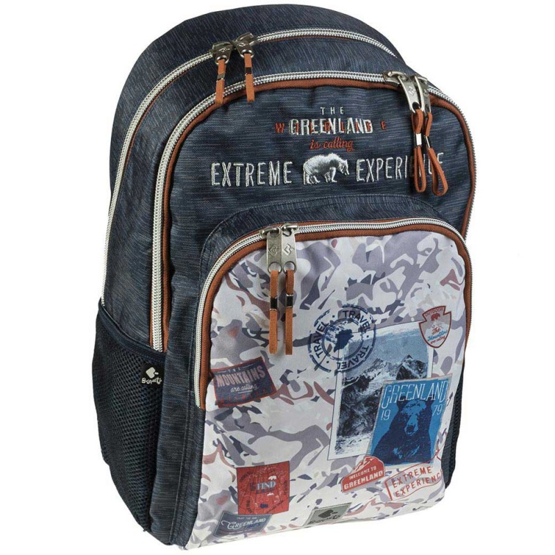 Il se combine avec le tissu camouflage gris, avec des patchs et des timbres de style vintage et des insignes en bleu profond et rouge rouille.