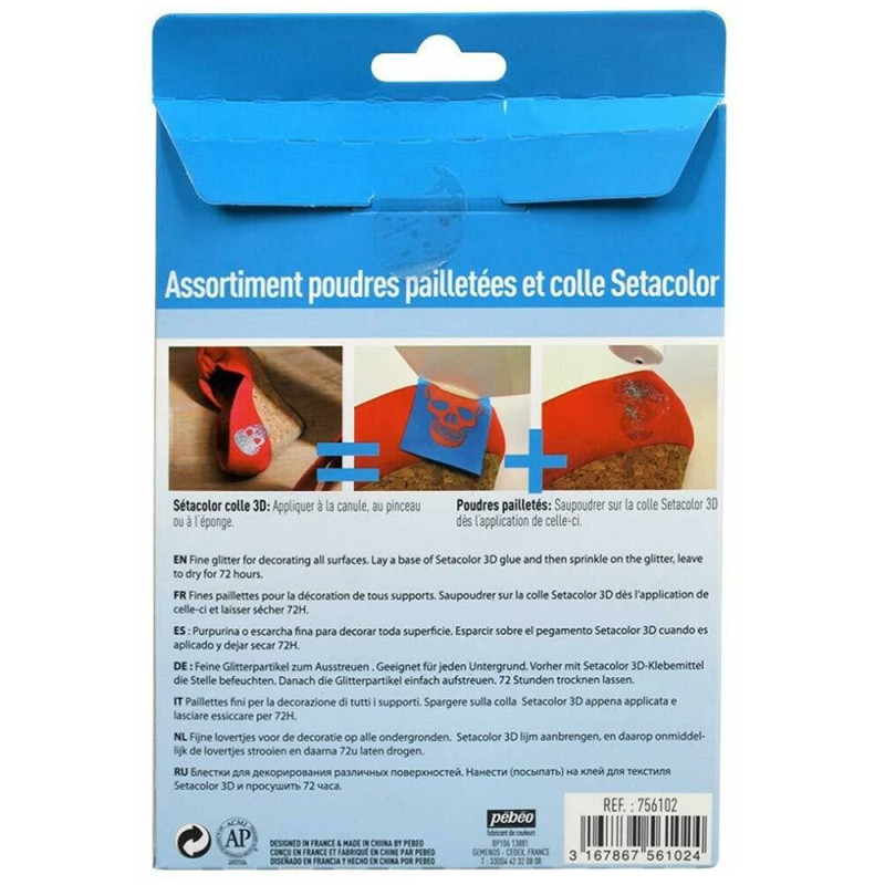 Coffret de 7 auxiliaires pour textiles : 1 colle et 6 poudres pailletées.