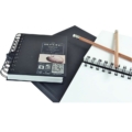 Papier sans acide, certifié FSC. Couverture noire rigide resistante à l’eau, livres spiralés ou cousus. Idéal pour crayon, pastel, stylo.