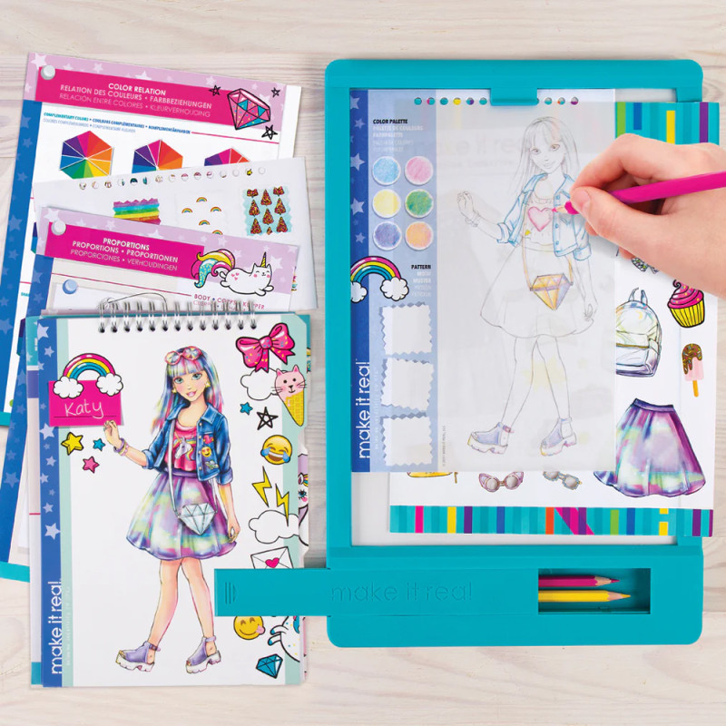 Les mini-mavens de la mode peuvent commencer avec le Fashion Design Mega Set, comprenant tout le nécessaire pour tracer, dessiner et colorier. En utilisant la lightbox pour tracer des motifs pré-imprimés, les enfants apprendront les bases du dessin de